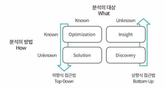 - ์ํฅ์ ์ ๊ทผ๋ฒ: ๋๊ท๋ชจ ๋ฐ์ดํฐ๊ฐ ์์ฑ๋๊ณ ๋น ๋ฅด๊ฒ ๋ณํ๋ ํ๋์์๋ ๋ฌธ์ ๊ฐ ๋ฌด์์ธ์ง ์ฌ์ ์ ์ ์ํ๋ ๊ฒ์ด ์ด๋ ต๊ธฐ ๋๋ฌธ์ ๋ค์ํ ๋ฐ์ดํฐ์ ์กฐํฉ ์์์ ์ธ์ฌ์ดํธ๋ฅผ ์ฐพ์๋ด๋ Bottom-Up ๋ฐฉ์
